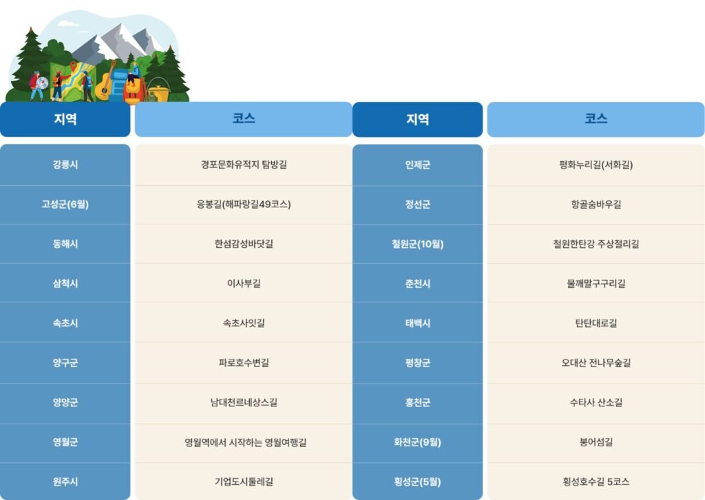 현장 행사(5월 횡성 호수길, 6월 고성 응봉길, 9월 화천 붕어섬길, 10월 철원 한탄강 주상절리길)와 인증 챌린지 프로그램으로 구성되어 있어 다양한 방식으로 참여가 가능합니다.